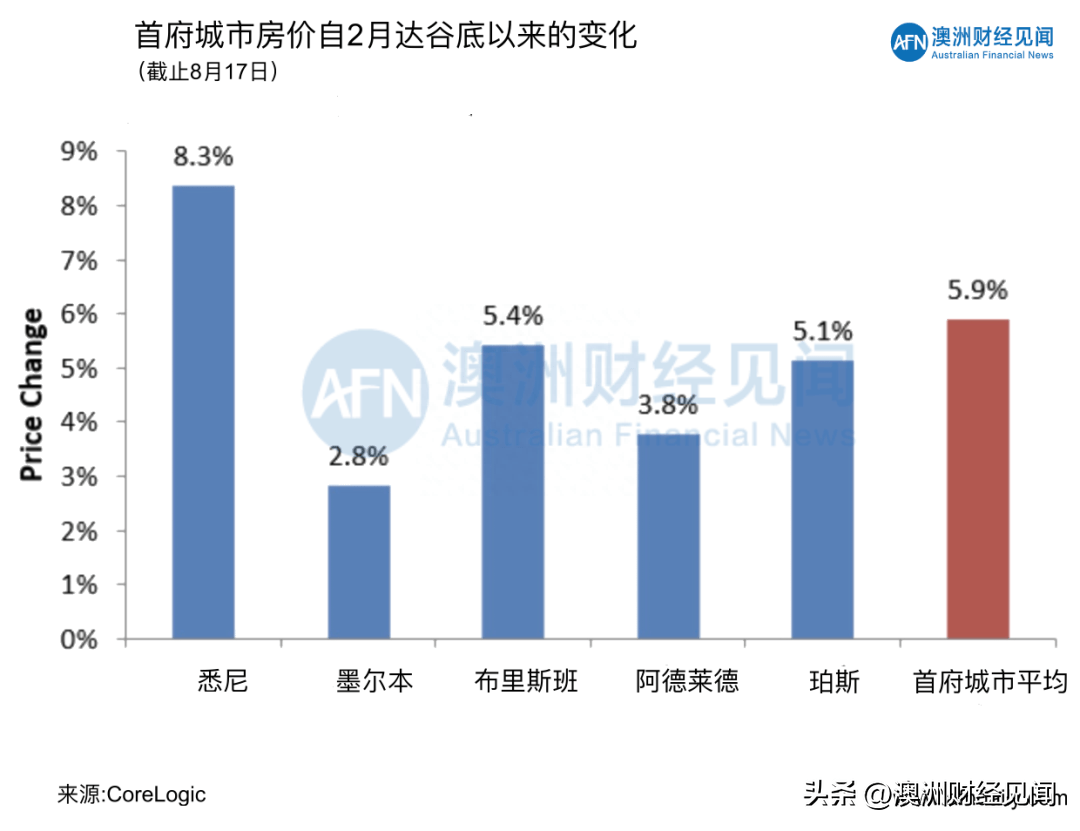 自房价指数于 2 月 7 日触底以来,5 个首府城市的房价总体反弹了 5.9%,其中悉尼以8.3%领跑,其次是布里斯班反弹了5.4%。