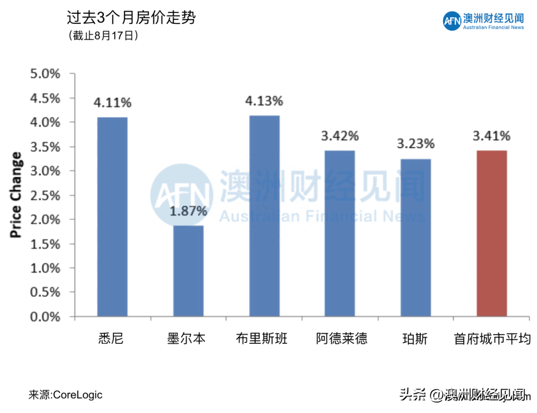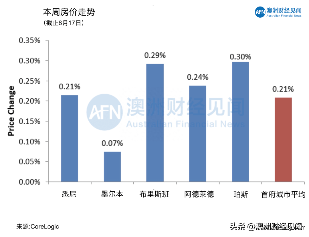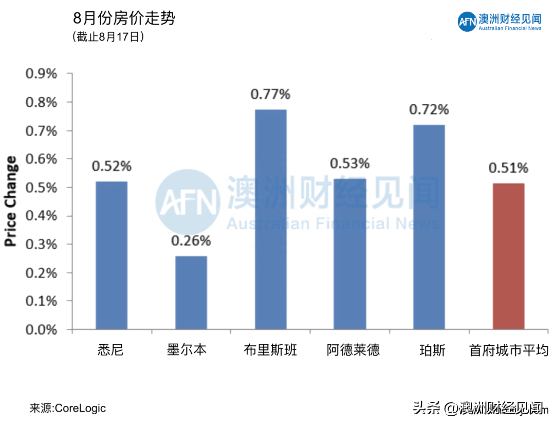 8月份到17号为止,5个首府城市的房价总体上涨了0.51%,其中布里斯班上涨0.77%和珀斯上涨0.72%领跑。