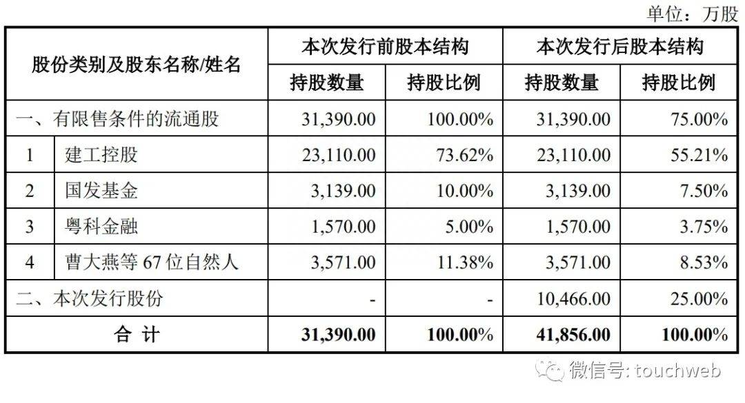 IPO后,建工控股持股为55.21%,国发基金持股为7.5%,粤科金融持股为3.75%。