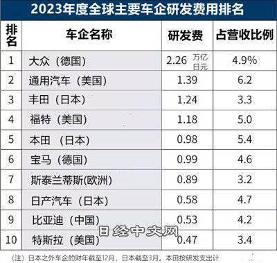 纵观整个汽车行业来说,如果随着产销规模的增大,研发费用率还能维持在10%的话,那绝对能算是一家“臭搞技术的公司”了。据日经中文网的报道,包括大众、通用、丰田、宝马等在内的全球主要跨国汽车集团研发费用率平均在5%左右。从表格中可以看到,研发费用率最高的是通用,而对研发投入金额最高的则是大众。