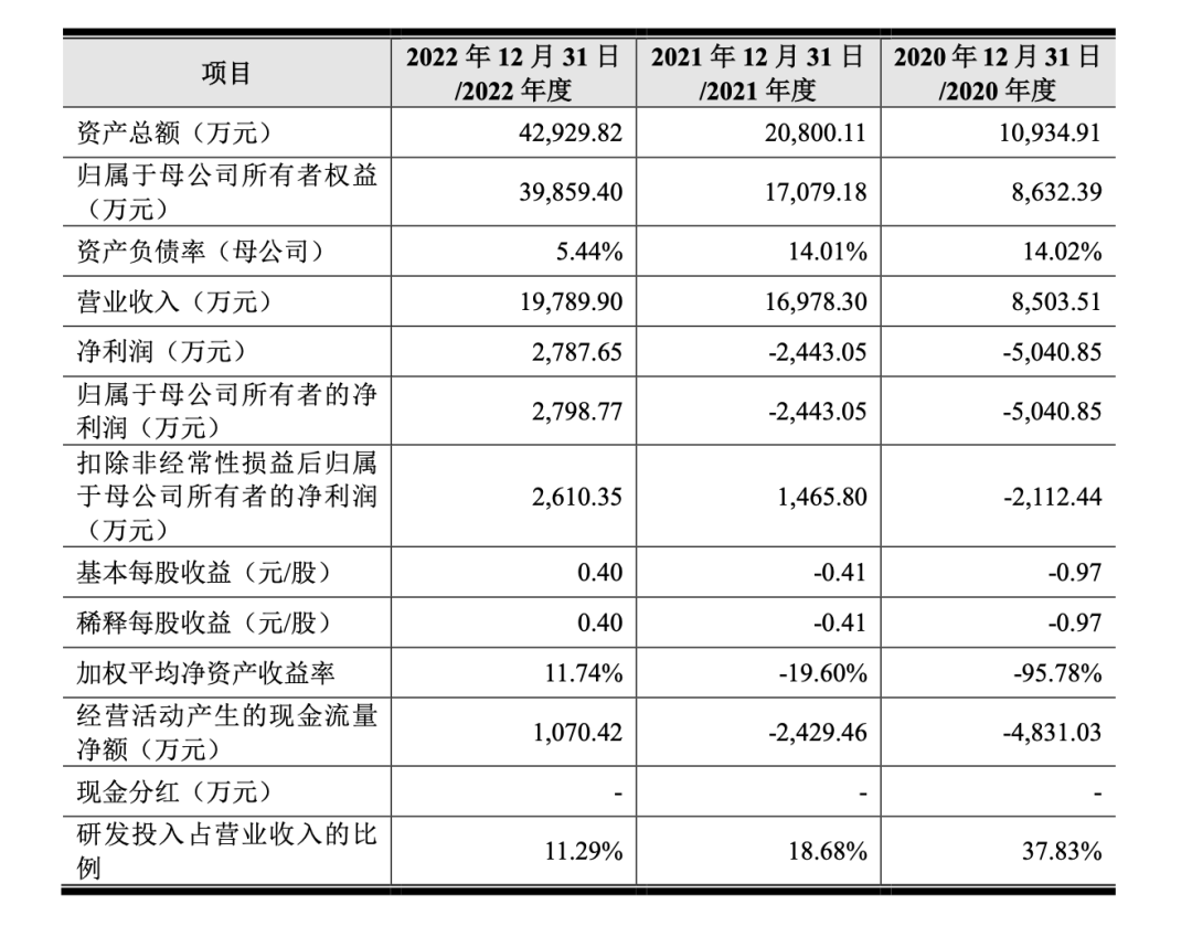 靠着传感器,公司营收近年节节攀升。招股书显示,2020年-2022年,公司营业收入分别约为8500万、1.69亿和1.97亿元,在此基础上,公司净利润由-5040.85万元、-2443.05万元转变为2798.77万元。