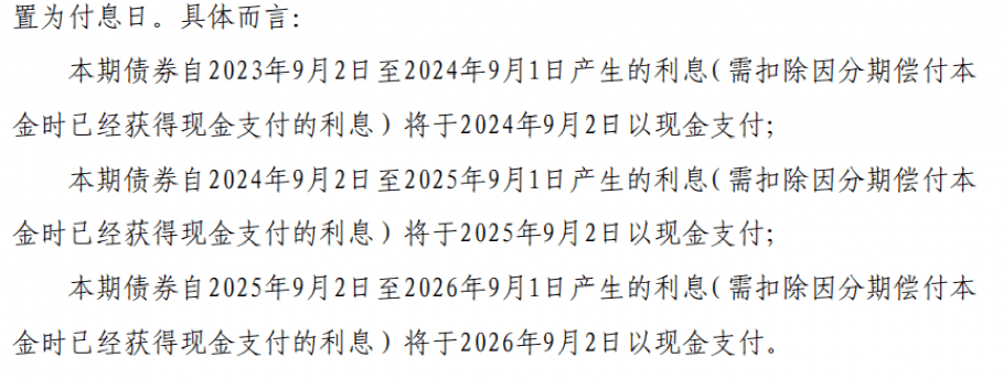 利息方面,发行期最后一年的利息在到期日前(即2023年9月2日)如期兑付,展期后的每期应支付的本金截至对应兑付日的应计未付利息随该期应支付的本金同时支付,利随本清。将每年9月2日设置为付息日。