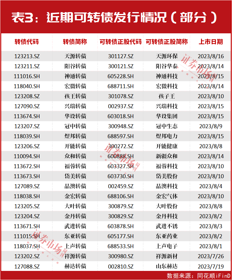 近阶段以来,可转债也正迎来密集上市。据不完全统计显示,今年以来,已有超百家公司发行可转债,而仅在8月以来,即有包括神通转债、宏微转债、孩王转债、兴瑞转债、华设转债等在内的约20只可转债上市(见表3)。
