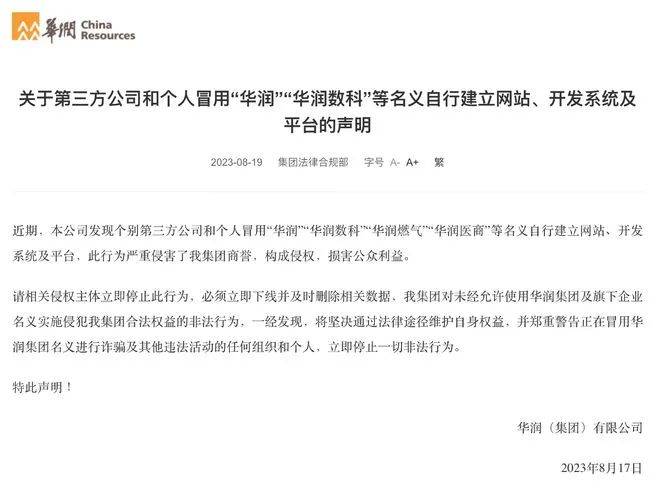 8月19日,华润集团官网发布声明:近期,公司发现个别第三方公司和个人冒用“华润”“华润数科”“华润燃气”“华润医商”等名义自行建立网站、开发系统及平台,此行为严重侵害了我集团商誉,构成侵权,损害公众利益。华润集团表示,请相关侵权主体立即停止此行为,必须立即下线并及时删除相关数据。