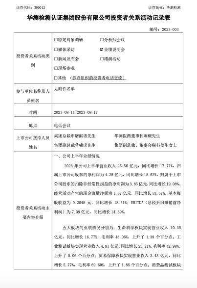 华测检测向投资者介绍了公司上半年业绩情况。2023年公司上半年营业收入25.56亿元,同比增长17.71%,归属上市公司股东的净利润为4.28亿元,同比增长18.62%。归属于上市公司股东的扣除非经常性损益的净利润为3.85亿元,同比增长19.08%。经营活动产生的现金流量净额为1.67亿元,同比增长53.57%。基本每股收益为0.2548元,同比增长18.51%;EBITDA(息税折旧摊销前净利润)为7.39亿元,同比增长14.69%。