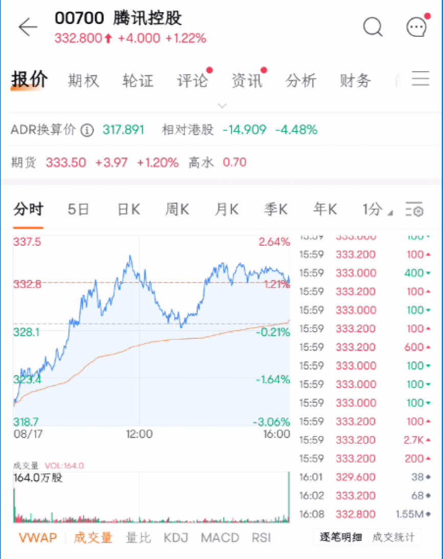 大盘上涨主要受到消费和科技股的支撑。腾讯控股绩后低开高走,振幅近5%,收涨1.22%于332.8港元。高盛上调腾讯目标价由428港元升至431港元,维持“买入”评级,并表示公司第二季度业绩大致符预期,广告业务同比涨34%强劲,抵消了本地游戏收入逊预期的影响,预计第三季度可恢复增长。