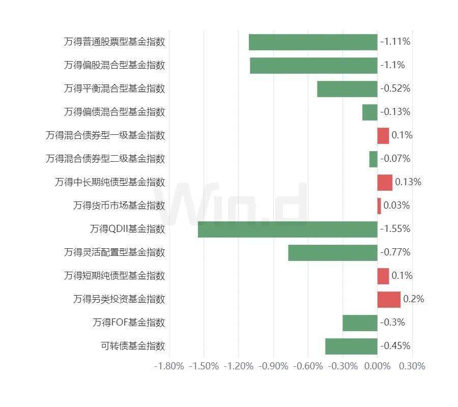 股权类基金普遍表现不佳,其中QDII基金指数、普通股票型基金指数、偏股混合型基金指数跌幅均超过1%。