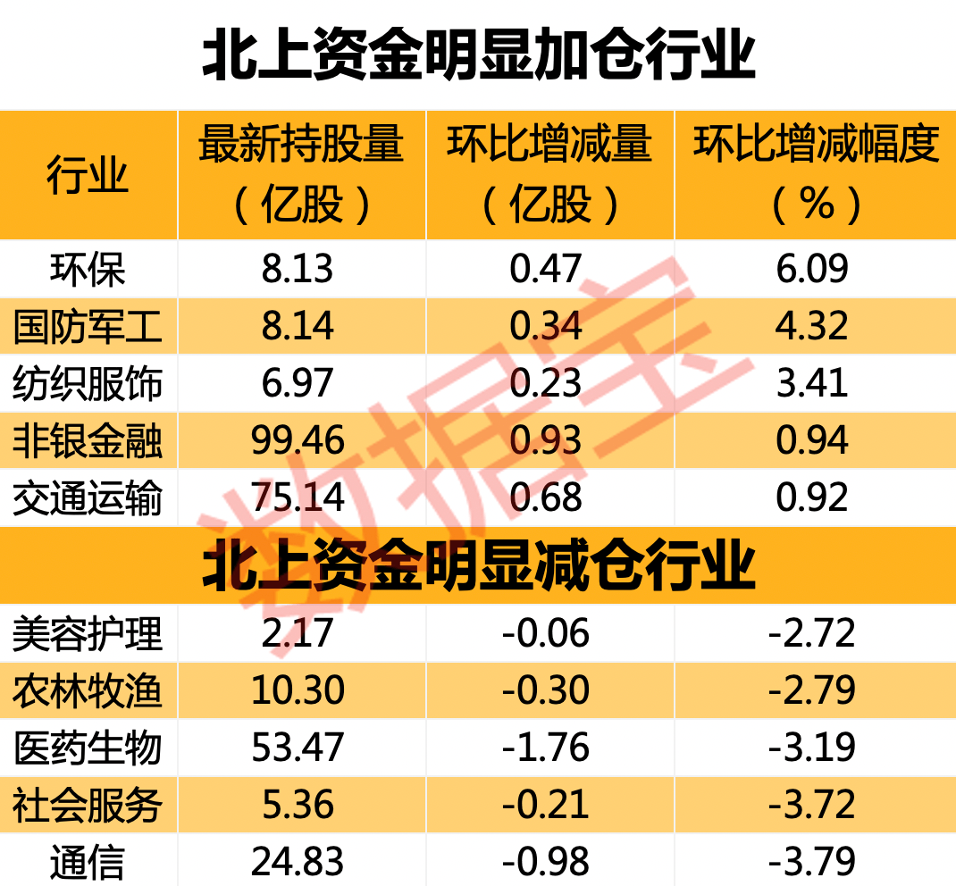 本周环保、国防军工、纺织服饰行业北上资金持股量增幅居前。