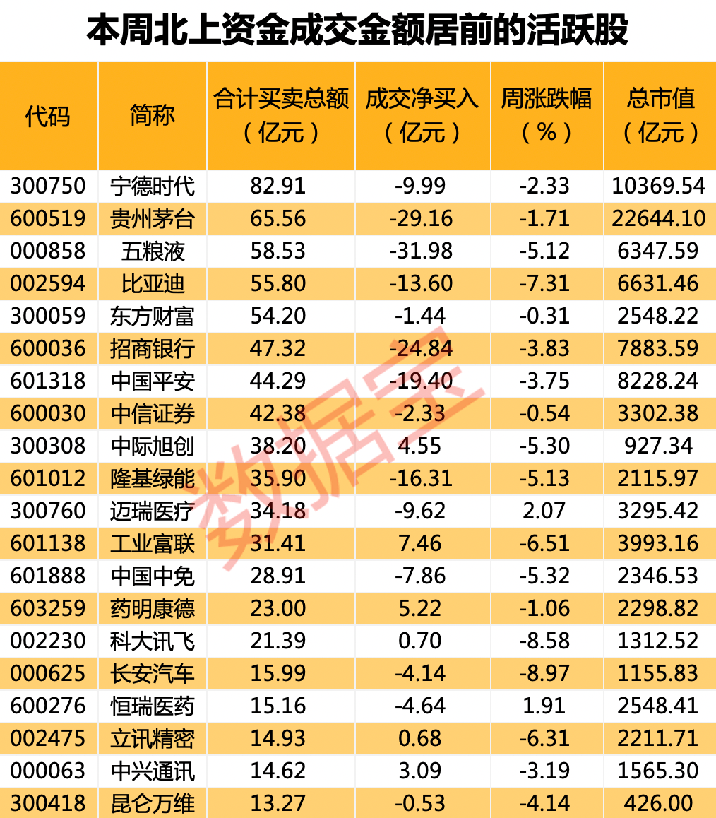 数据宝统计显示,本周共有30股登上北上资金成交活跃榜。所属行业来看,非银金融、食品饮料、电气设备股本周成交活跃,合计买卖总额在100亿元以上。计算机、通信、电子行业获得净买入,食品饮料、电气设备、银行、非银金融股净卖出均在20亿元以上。