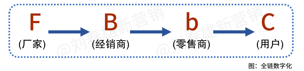 全链数字化,就是快消品传统渠道的所有参与者F(厂家)、B(经销商)、b(零售商)、C(用户),一个都不能少。具体表现形式就是F2B2b2C。