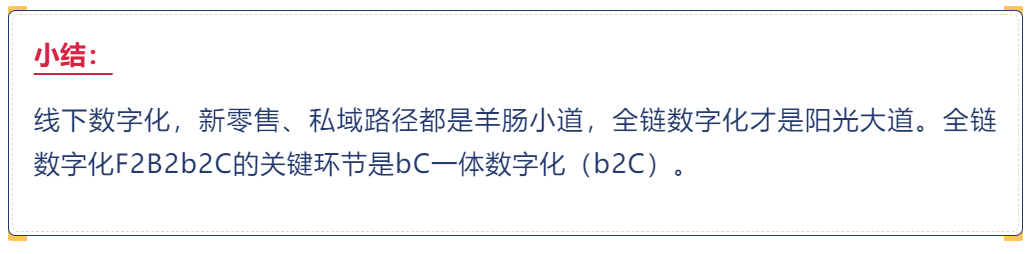 对于深度分销体系健全的快消头部企业,全链F2B2b2C中,F、B、b都是受控环节,只有b2C是不受控环节。只要完成了b2C数字化,就相当于完成了全链数字化。所以渠道数字化最后聚焦在bC一体数字化。