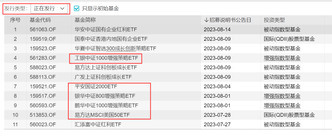 从目前正在发行的ETF来看,同样不乏行业主题和跨境类产品。比如,易方达MSCI美国50ETF于8月2日起发行。宽基指数ETF方面,正在发行的有平安国证2000ETF、工银中证1000增强策略ETF、银华中证800增强策略ETF、 鹏华中证1000增强策略ETF。另外,景顺长城国证2000ETF于9月4日起发行。而在此前,还有10家公募上报了中证2000ETF。