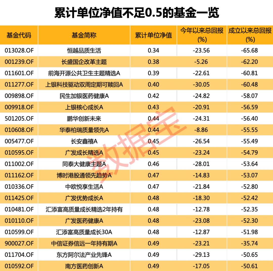 根据最新净值数据,20只基金累计净值低于0.5,其中恒越品质生活基金累计净值0.34,长盛国企改革主题基金累计净值为0.38,前海开源公共卫生主题精选A基金累计净值为0.39。