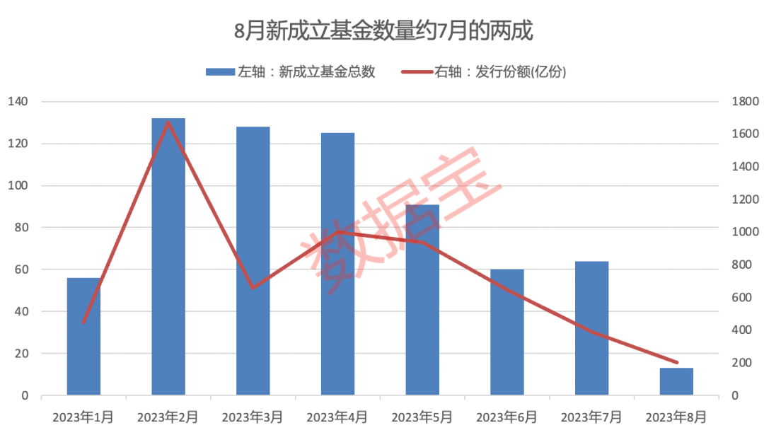 Wind数据显示,按照基金认购起始日统计,今年5月以来,新基金发行数量和发行份额呈逐渐减少趋势。5月至7月,新成立基金的数量分别为91只、60只、64只,新成立基金份额分别为938.07亿份、645亿份、389.33亿份。目前8月已过半,月内新成立基金的数量和规模分别为13只和202.27亿份,成立数量约7月的两成。