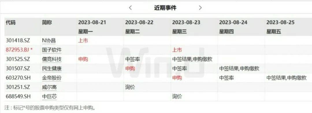 Wind数据显示,8月21日至8月25日,有三只新股申购,北交所、创业板和沪市主板各一只。有两只新股上市,分别是在创业板上市的协昌科技和在北交所上市的国子软件。