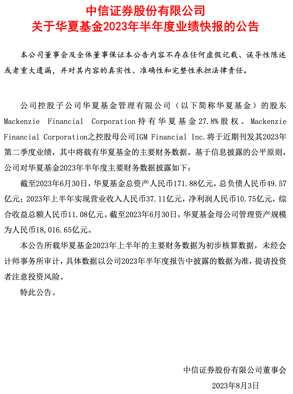 8月3日,中信证券股份有限公司(中信证券,600030)披露了旗下控股子公司华夏基金的2023年半年度业绩快报公告。