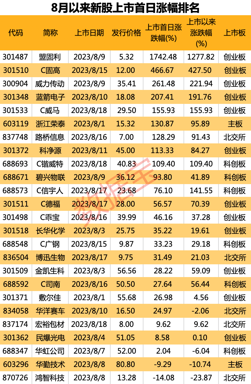 数据宝统计,8月新股上市首日平均收益达151.73%。从9日创业板新股盟固利盘中大涨37倍伊始,8月以来上市新股的表现就令市场颇为关注。