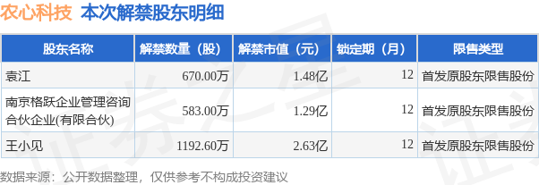 根据市场公开信息整理,农心科技(001231)于8月21日将有2445.6万股限售股份解禁上市,为公司首发原股东限售股份,占公司总股本24.46%。本次解禁后,公司还有6451.35万股限售股份,占总股本64.51%。具体如下图所示: