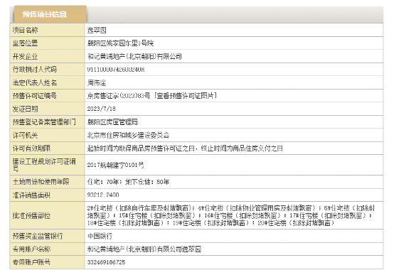 近日,据北京市住建委官网披露,“御翠园”位于北京市朝阳区姚家园东里1号院,备案名“逸翠园”,由长江实业旗下和记黄埔地产(北京朝阳)有限公司开发。该项目于今年7月18日获得预售证。
