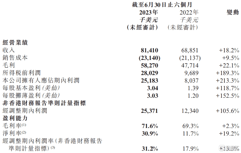 另一方面,支出端上来看,公司三大营运开支管控良好,2023上半年,公司销售及分销开支、一般及行政开支(剔除上市开支)及研发开支分别占总收入的23.7%、11.7%及8.4%,较去年同期的分别23.9%、11.8%及9.8%均略有下降。
