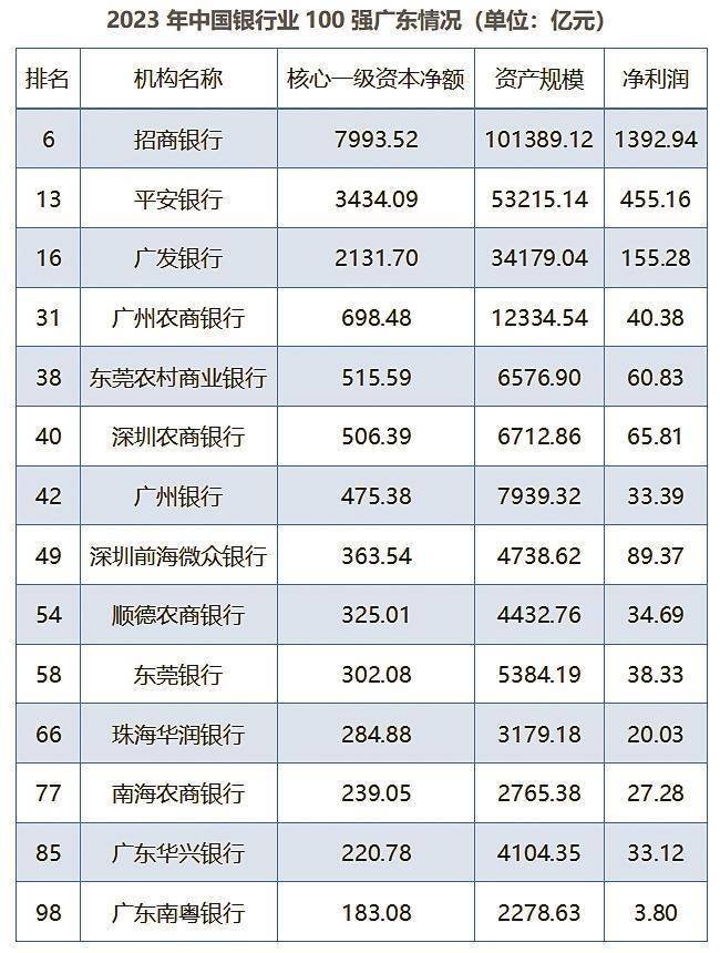 不妨将目光聚焦广东,跻身百强的银行总部“版图”分别覆盖深圳、广州、东莞、佛山、湛江、珠海等地。具体来看,除了“火车头”招商银行,另有平安银行、广发银行两家股份行,位列第13、第16,核心一级资本净额均突破千亿元级别,净利润也超出百亿元。