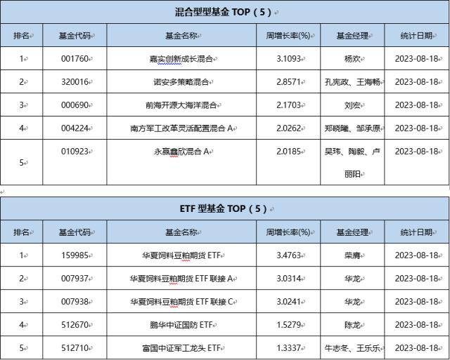 单基金方面,剔除掉创新封基类型基金的影响,上周业绩表现最好的基金为华夏饲料豆粕期货ETF,周涨跌幅为3.4763%,为ETF型基金;分基金类型看,同样剔除掉分级杠杆及固定收益两类基金的影响,股票型基金冠军为前海开源中航军工指数A,周涨跌幅为1.2833%;债券型基金冠军为中航瑞苏纯债债券C,周涨跌幅为2.5300%; 混合型基金冠军为嘉实创新成长混合,周涨跌幅为3.1093%; 货币型基金冠军为渤海汇金汇添金货币B,周涨跌幅为0.0535%;ETF型基金冠军为华夏饲料豆粕期货ETF,周涨跌幅为3.4763%;LOF型基金冠军为鹏华空天一体C(LOF),周涨跌幅为1.7132%;QDII基金冠军为华泰柏瑞中证韩交所中韩半导体ETF(QDII),周涨跌幅为-2.3775%;下面是不同类型基金周涨跌幅TOP5 (剔除掉分级基金的影响)