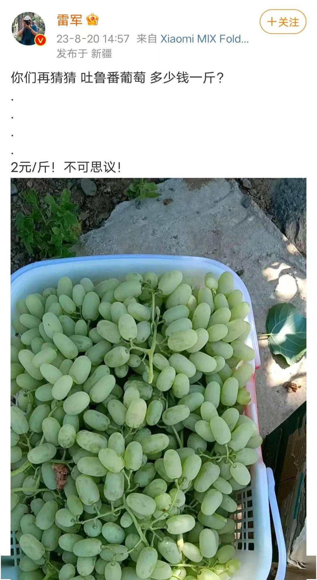 随后,雷军又晒出吐鲁番葡萄的照片,配文:“你们再猜猜吐鲁番葡萄多少钱一斤?2元/斤!不可思议! ”