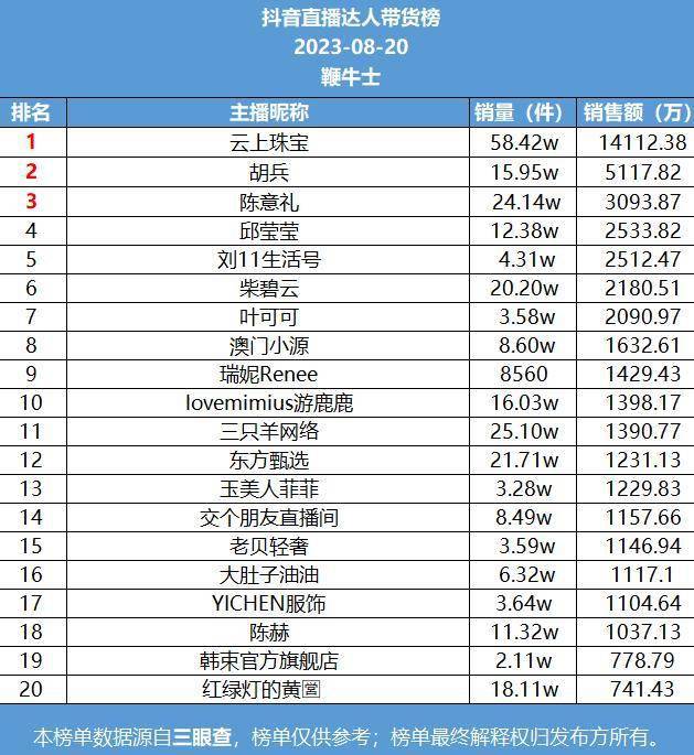 8月20日,抖音直播达人带货榜一是云上珠宝,销售额14112.38万;榜二胡兵,销售额5117.82万;榜三陈意礼,销售额3093.87万。