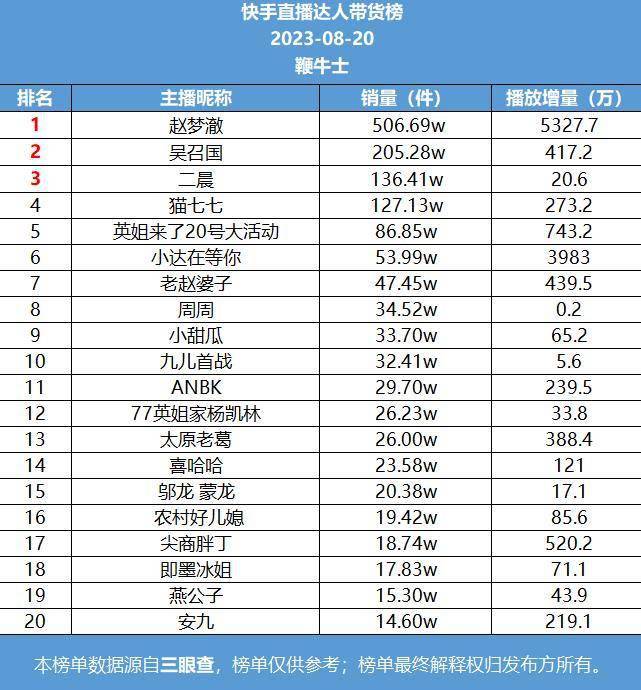 【直播带货日榜】是鞭牛士和三言科技推出的多个平台达人每日直播带货榜单。根据第三方数据平台“三眼查”提供的数据,鞭牛士将对快手、抖音平台的达人带货交易量、GMV、播放量进行统计和分析,以供各位从业者参考。