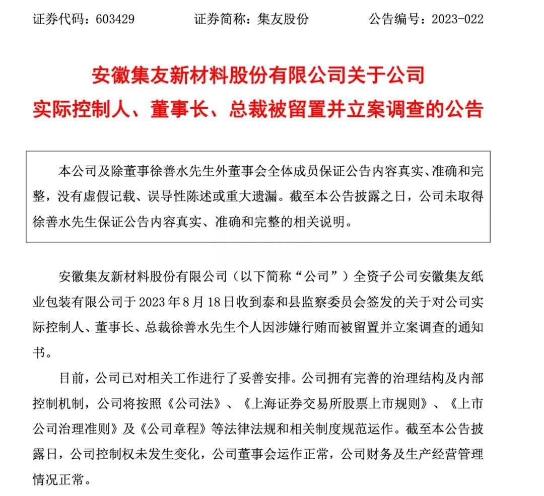 8月20日,集友股份(603429.SH,股价9.47元,市值49.67亿元)公告,公司全资子公司安徽集友纸业包装有限公司于2023年8月18日收到泰和县监察委员会签发的关于对公司实际控制人、董事长、总裁徐善水个人因涉嫌行贿而被留置并立案调查的通知书。