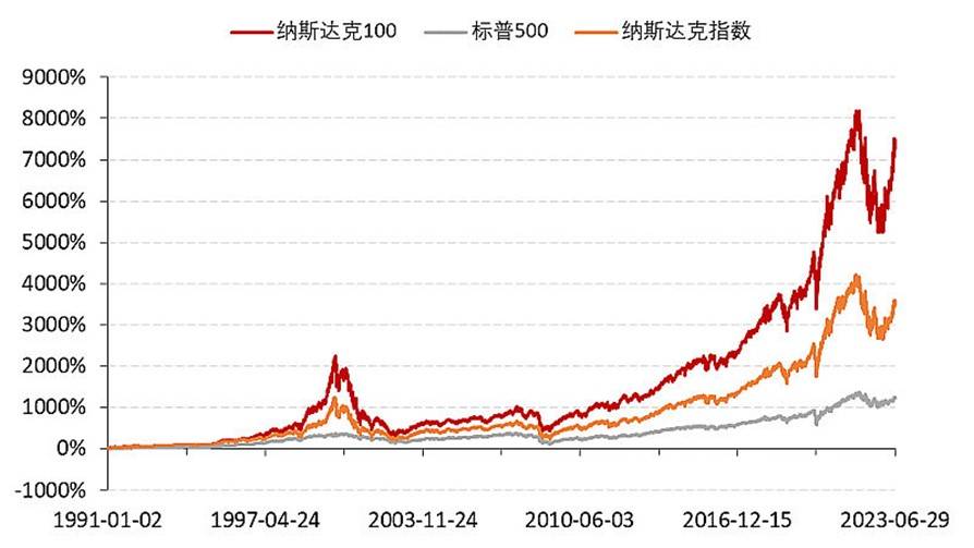 根据公开资料,纳斯达克指数包含100家在纳斯达克上市的非金融公司,纳斯达克市场自诞生以来成功孵化出了一大批科技巨头,被广泛认为是培育创新型、科技型、成长型公司最成功的投资市场之一。作为纳斯达克市场的旗舰指数,纳斯达克100指数长期涨幅明显跑赢纳斯达克指数。自1991年起,纳斯达克100指数30多年来年化收益14.13%,明显高于纳斯达克的11.65%。(数据截至2023.6.30)