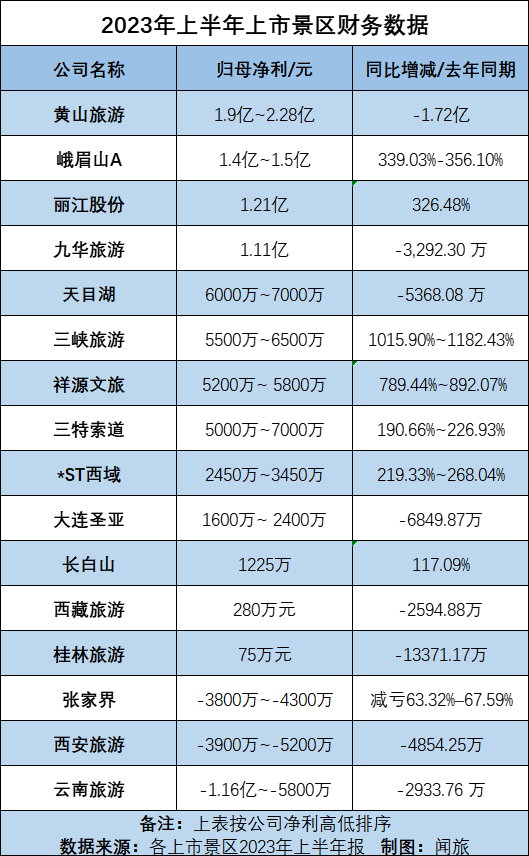 其中超亿元的有4家,分别为黄山旅游、峨眉山A、丽江股份、九华旅游。在这当中,净利最高的为黄山旅游,其2023年上半年预计实现净利润1.9亿~2.28亿元,较比去年同期的亏损1.72亿元出现大幅增长。