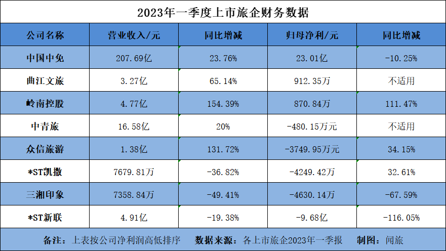 旅行社及集团一季度净利润前三甲为中国中免、曲江文旅和岭南控股,分别实现净利润23.01亿元、912.35万元和870.84万元。其余上市旅企来看,排除未公布涨幅的企业后,除三湘印象、*ST新联、云南旅游外均呈现不同程度的亏损缩窄。