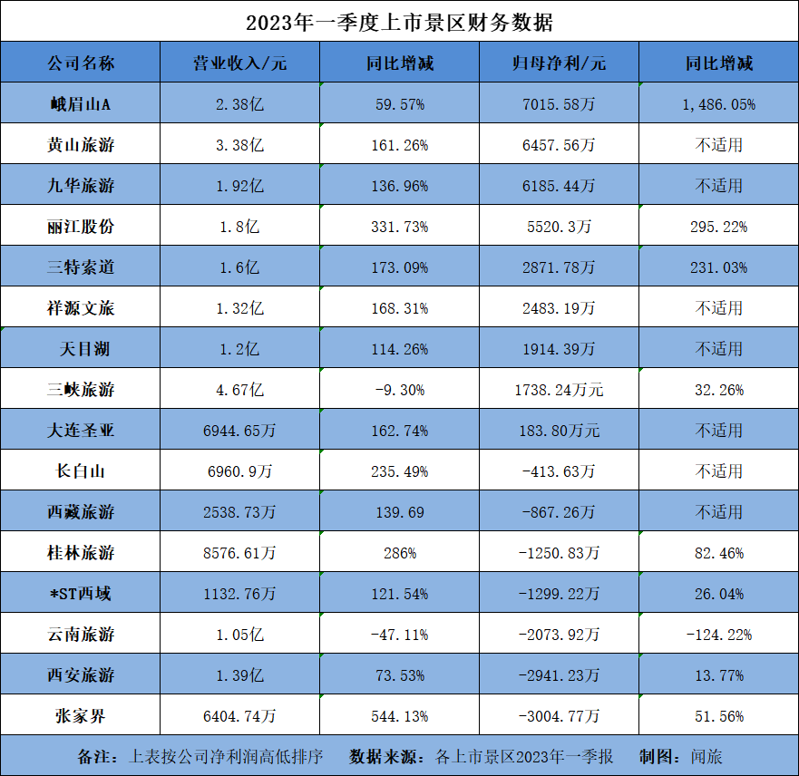 其中景区类企业中一季度净利润前三甲分别为峨眉山A、黄山旅游和九华旅游,2023年一季度实现归母净利润分别为7015.58万元、6457.56万元和6185.44万元,较比去年同期大幅增加。