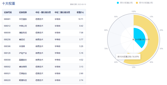 截至2023年8月18日,该指数前十大权重股包括中芯国际、中微公司、澜起科技、寒武纪、华润微等,前十大权重股合计占比56.69%。(数据来源:中证指数公司,截至2023年8月18日,指数成份股不代表个股推荐)