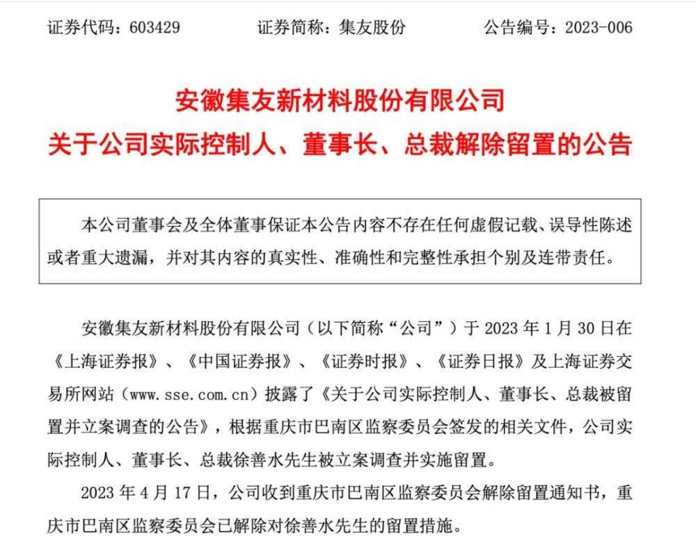 公告显示,今年4月17日,集友股份收到重庆市巴南区监察委员会解除留置通知书,重庆市巴南区监察委员会已解除对徐善水的留置措施。目前徐善水能够正常履行公司董事长、法定代表人、总裁职责。