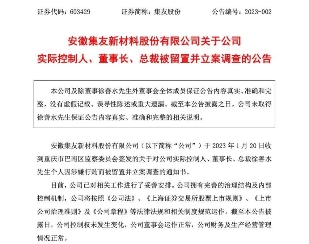 今年1月29日,集友股份公告,公司于1月20日收到重庆市巴南区监察委员会签发的“关于对公司实际控制人、董事长、总裁徐善水个人因涉嫌行贿而被留置并立案调查的通知书”。