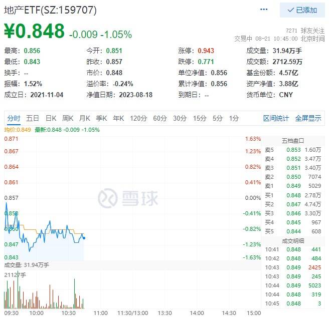 8月21日早盘,地产板块水下震荡,滨江集团跌逾2%,招商蛇口、华发股份、保利发展等下跌超1%。代表ETF方面,地产ETF(159707)场内价格下跌超1%,成交额超2800万元。