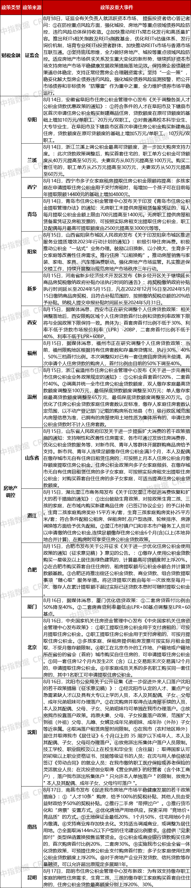 表:8月14日至8月20日房地产市场重点政策及事件汇总