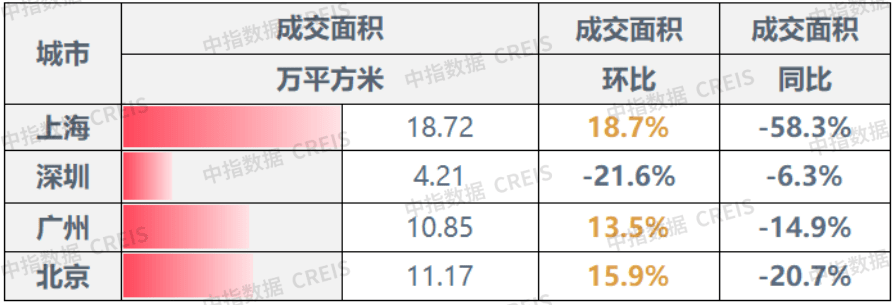 ▍一线城市:整体成交面积环比上升11.44%,上海涨幅领衔,深圳同环比均下降