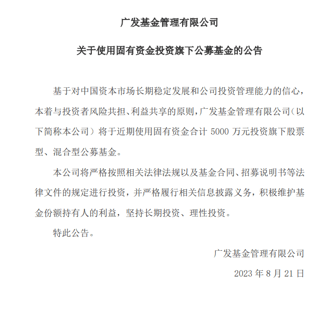 上证报中国证券网讯 (记者 陆海晴)8月21日,广发基金公告称,基于对中国资本市场长期稳定发展和公司投资管理能力的信心,本着与投资者风险共担、利益共享的原则,广发基金将于近期使用固有资金合计 5000 万元投资旗下股票型、混合型公募基金。