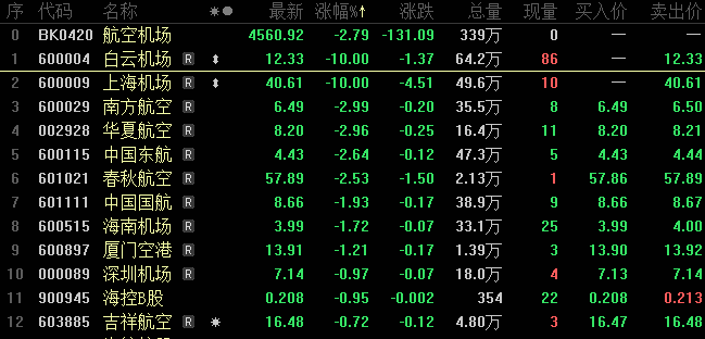 早盘,上海机场、白云机场双双跌停,南方航空、中国东航、中国国航等跟跌。