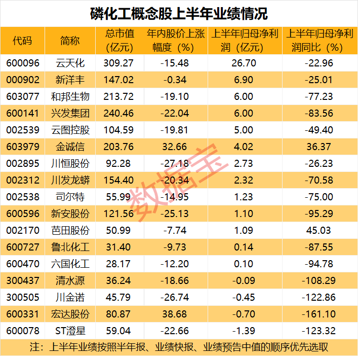 业绩方面来看,目前概念股均发布了半年报或业绩预告,按照半年报、快报、业绩预告下限的顺序优先选取,超7成个股上半年业绩盈利,清水源、川金诺、宏达股份、ST澄星上半年业绩亏损。