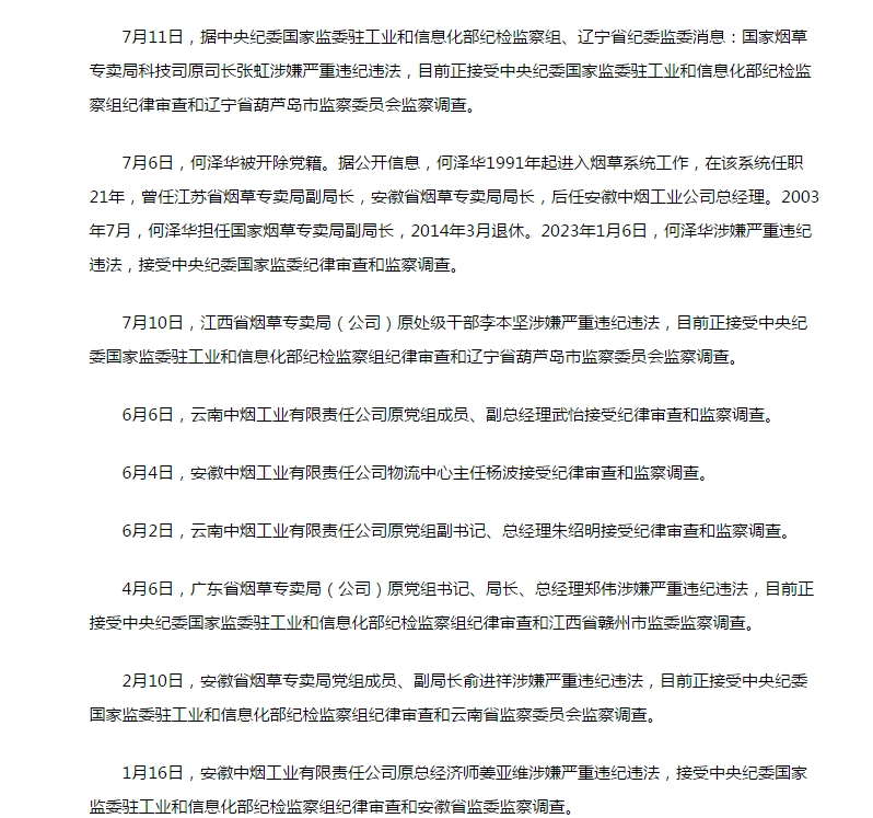 据媒体报道,反腐风暴之下,烟草系统案件频发,今年以来已有多位官员及高级管理人员因涉嫌严重违纪违法被调查或查处。