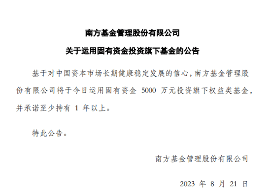 南方基金发布公告称,基于对中国资本市场长期健康稳定发展的信心,南方基金管理股份有限公司将于今日运用固有资金5000万元投资旗下权益类基金,并承诺至少持有1年以上。