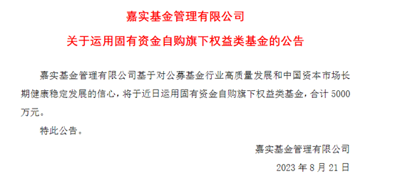 嘉实基金21日发布关于运用固有资金自购旗下权益类基金的公告表示,基于对公募基金行业高质量发展和中国资本市场长期健康稳定发展的信心,将于近日运用固有资金自购旗下权益类基金,合计5000万元。