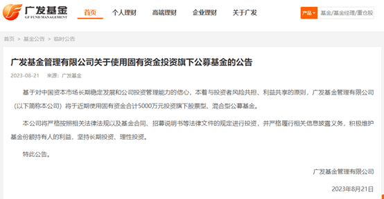 广发基金21日发布公告称,基于对中国资本市场长期稳定发展和公司投资管理能力的信心,本着与投资者风险共担、利益共享的原则,广发基金管理有限公司将于近期使用固有资金合计5000万元投资旗下股票型、混合型公募基金。