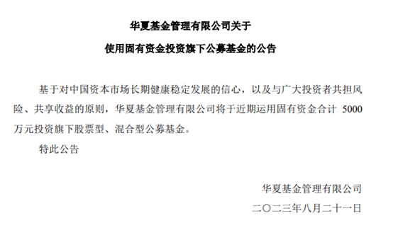 华夏基金21日发布关于使用固有资金投资旗下公募基金的公告。公告称,基于对中国资本市场长期健康稳定发展的信心,以及与广大投资者共担风险、共享收益的原则,华夏基金管理有限公司将于近期运用固有资金合计5000万元投资旗下股票型、混合型公募基金。