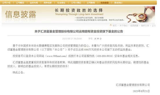 汇添富基金21日发布关于汇添富基金管理股份有限公司运用固有资金投资旗下基金的公告。公告称,基于对中国资本市场长期健康稳定发展和公司投资管理能力的信心,本着与广大投资者风险共担、利益共享的原则,汇添富基金管理股份有限公司(简称“本公司”)将于近日出资5000万元投资本公司旗下主动权益类基金。
