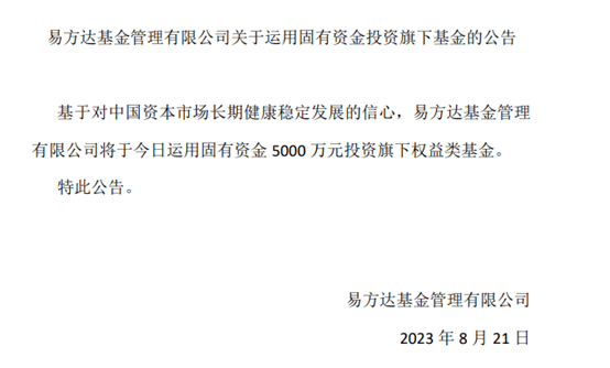 易方达基金发布公告称,基于对中国资本市场长期健康稳定发展的信心,易方达基金管理有限公司将于今日运用固有资金5000万元投资旗下权益类基金。